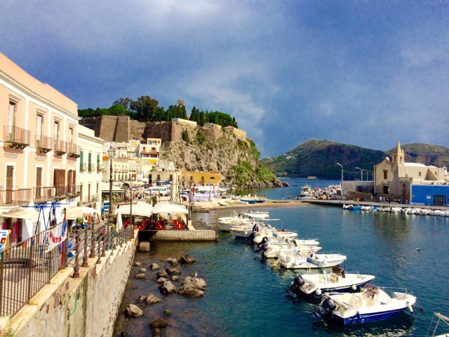 Deep fried mini-squid; steak with arugula and Parmesan; lasagna. Lipari port, Aeolian Islands