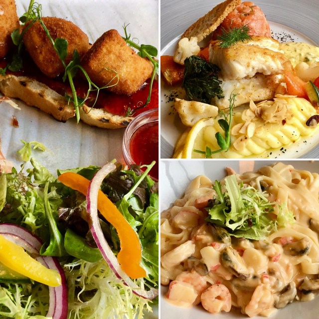 Fried Icelandic cheese with grilled bread, red currant jam, and mixed greens; blue ling with Arctic char tartare, almond mashed potatoes, and mixed vegetables; pasta with lobster, mussels, shrimp, and salmon with cream sauce. Geysir Bistro, Reykjavik, Iceland