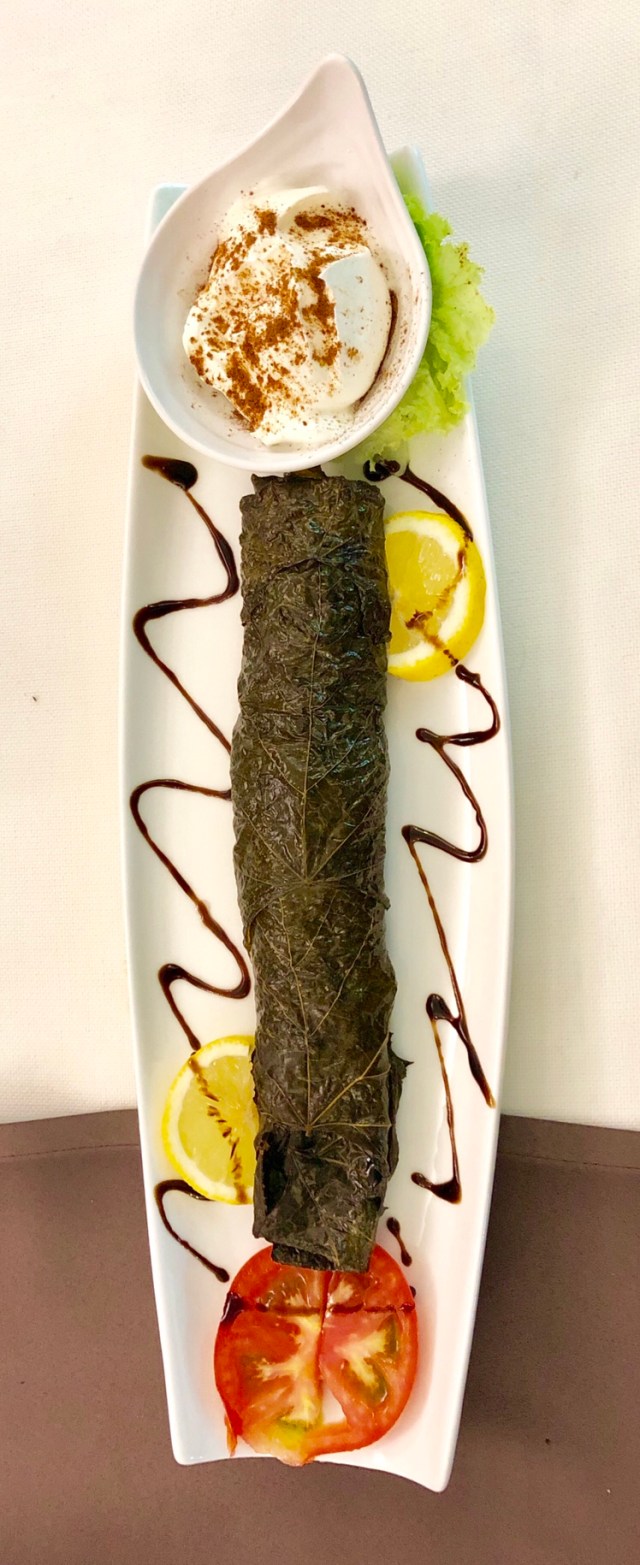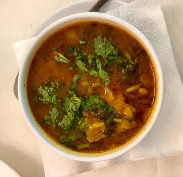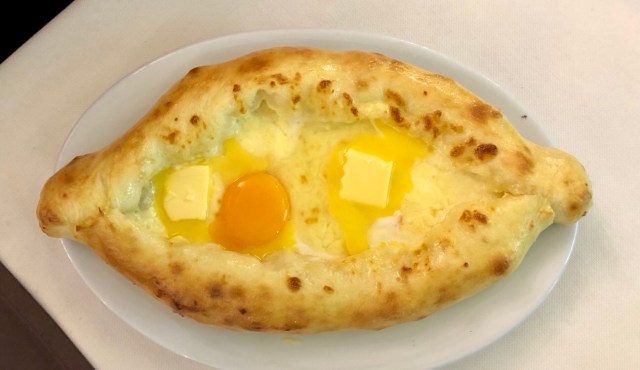 Kharcho soup (beef, rice, walnut, cherry plum purée, and fresh coriander); khachapuri adjaran (cheese-filled bread with butter and egg); trout with walnuts and pomegranates wrapped in grape leaves with cinnamon yogurt