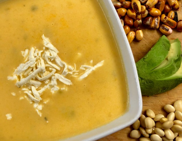 Shrimp ceviche in tomato sauce with fried plantains, popcorn, and Andean toasted corn; locro quiteño (potato and cheese soup) with Andean toasted corn, avocado, and chochos (lupin beans)
