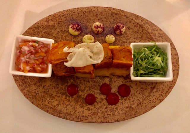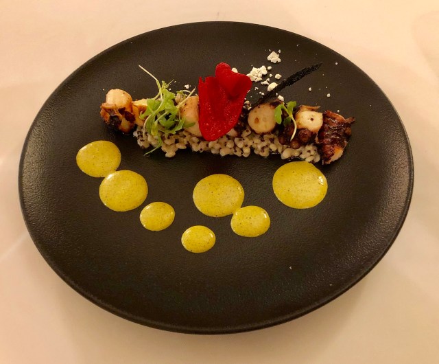 Octopus with black and red quinoa, pearl barley, and yellow pepper aioli; shrimp and corn cake amuse bouche; slow-cooked pork rib with sweet and sour onion relish, chola potato patties, and avocado tuile; pork neck with banana sauce, smoked Amazonian chili pepper, lemon verbena vinaigrette, and sweet potato terrine