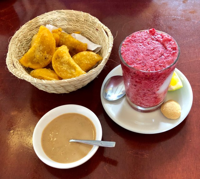 Empanaditas de pipián (potato and peanut mini empanadas with spicy peanut sauce) and salpicón payanés (blackberry and guanabana frozen drink). Mora Castilla restaurant, Popayán, Colombia Share this: Share on X (Opens in new window) X Share on Facebook (Opens in new window) Facebook Like Loading...