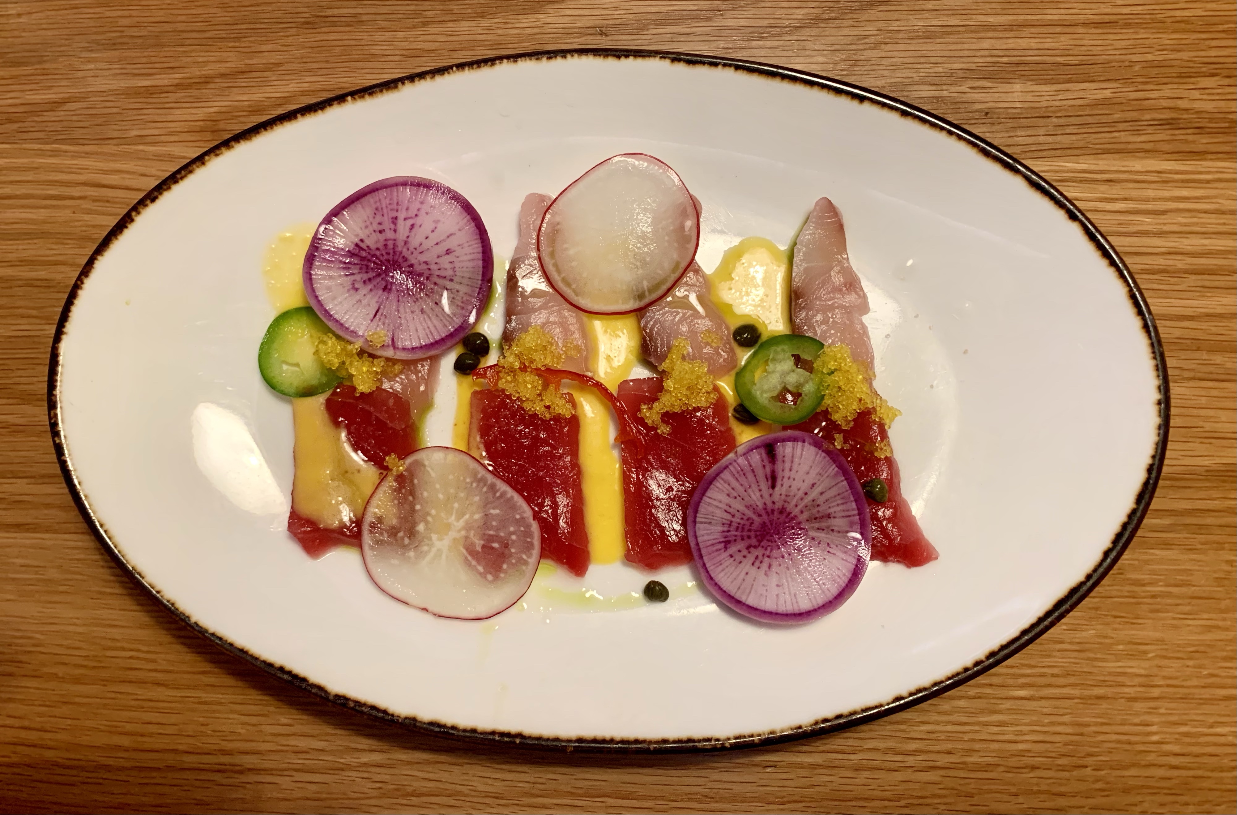 Ahi tuna and Kona kanpachi crudo with mango-calamansi emulsion, jalapeño, yuzu caviar, chili oil, and watermelon radish; kiawe wood-smoked pork chop with roasted garlic mash, lemon-scented grilled asparagus, red bell pepper and cherry pepper scarpariello sauce
