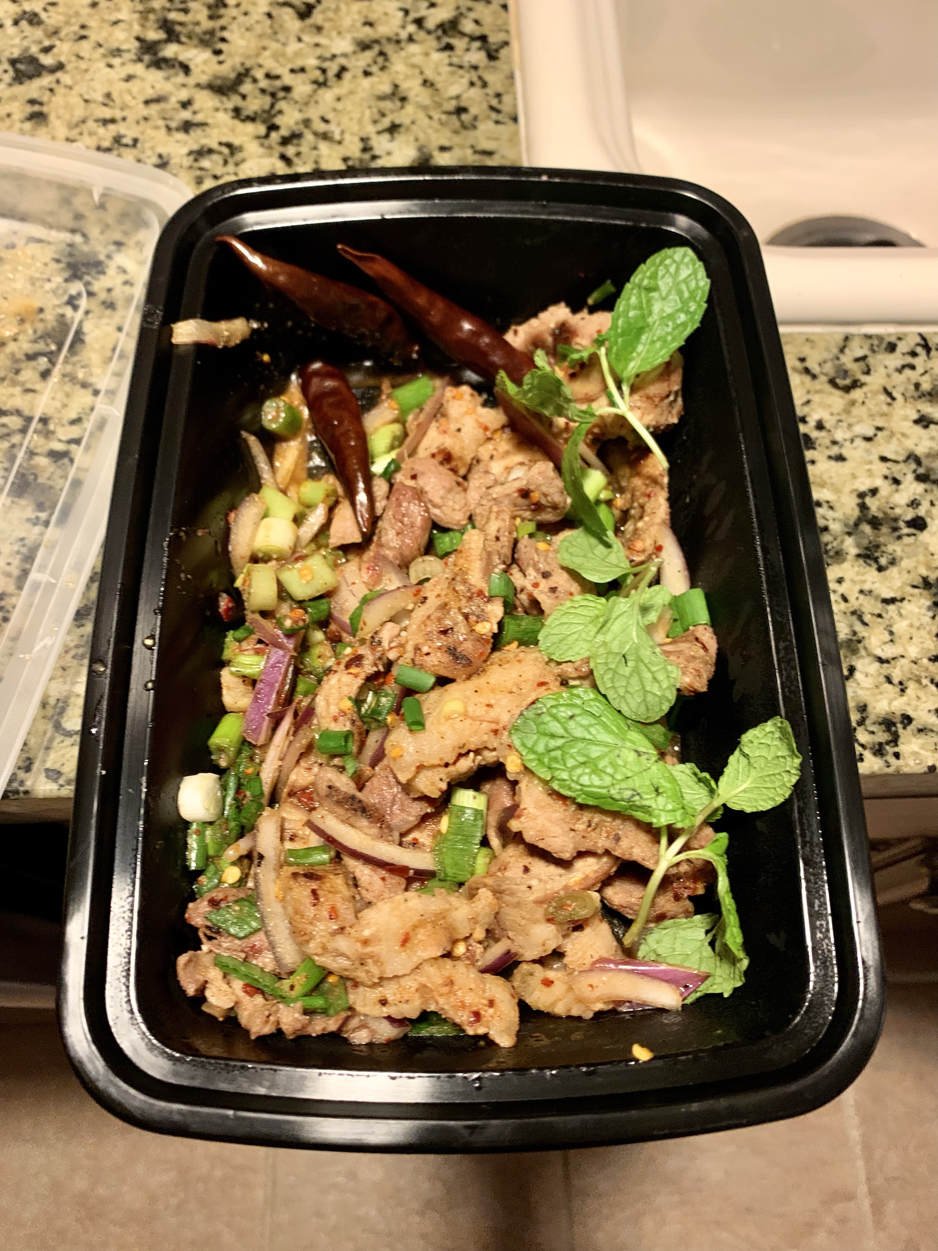 2) Northern Thai grilled pork with rice powder, red onion, scallions, mint, and chilies