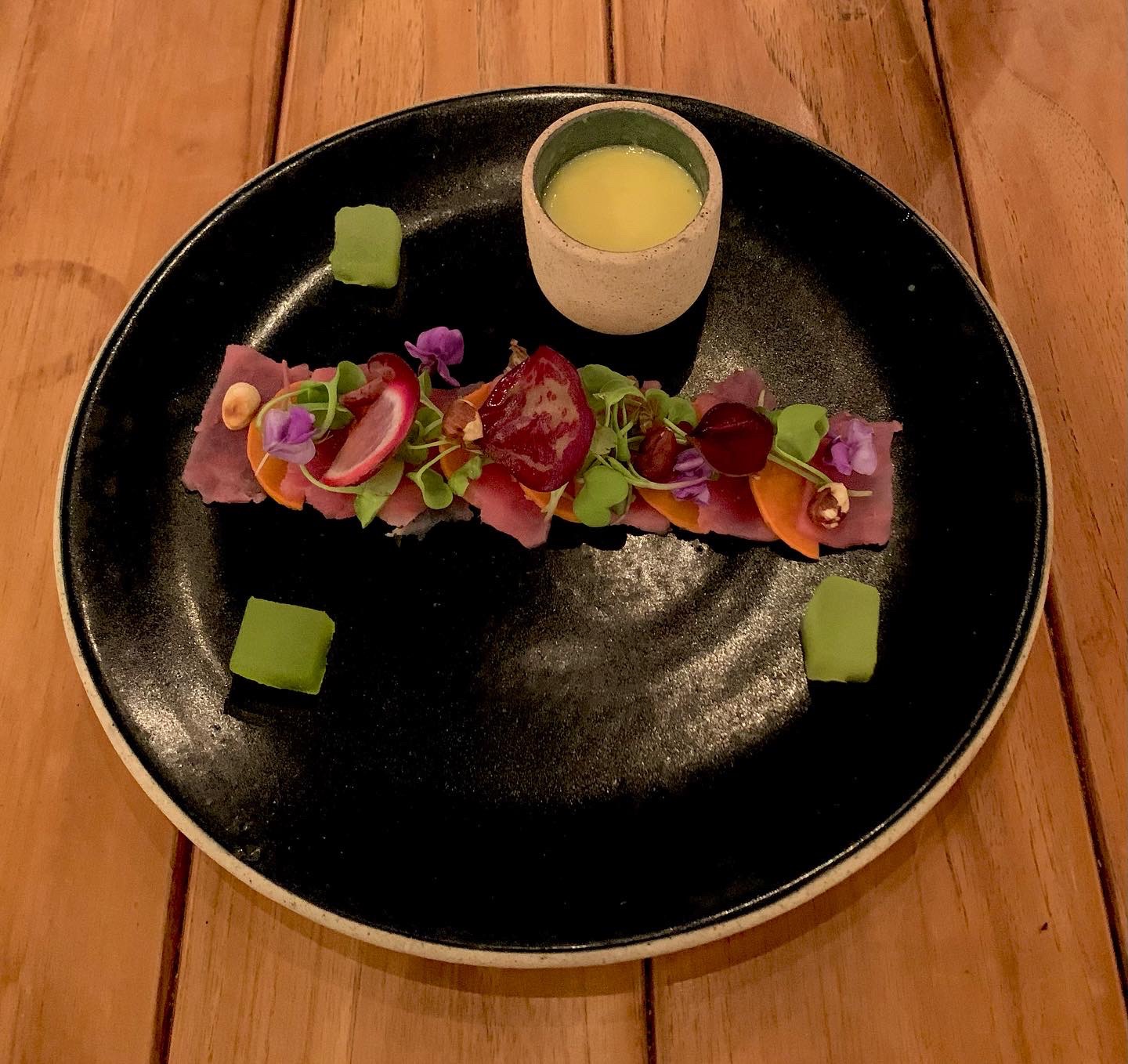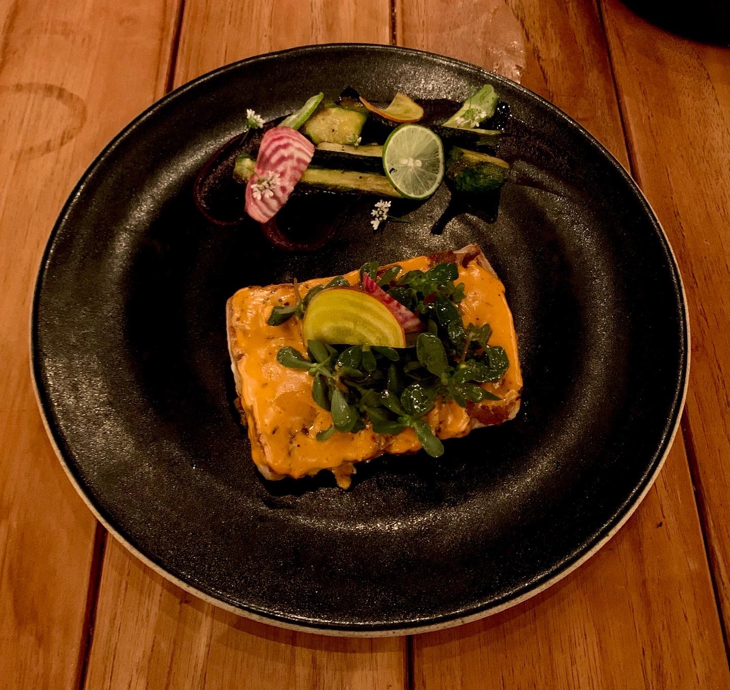 tuna tiradito with mango, jicama, serrano, leche de tigre, and lime; 2) grilled Baja sea bass with roasted salsa and garden greens