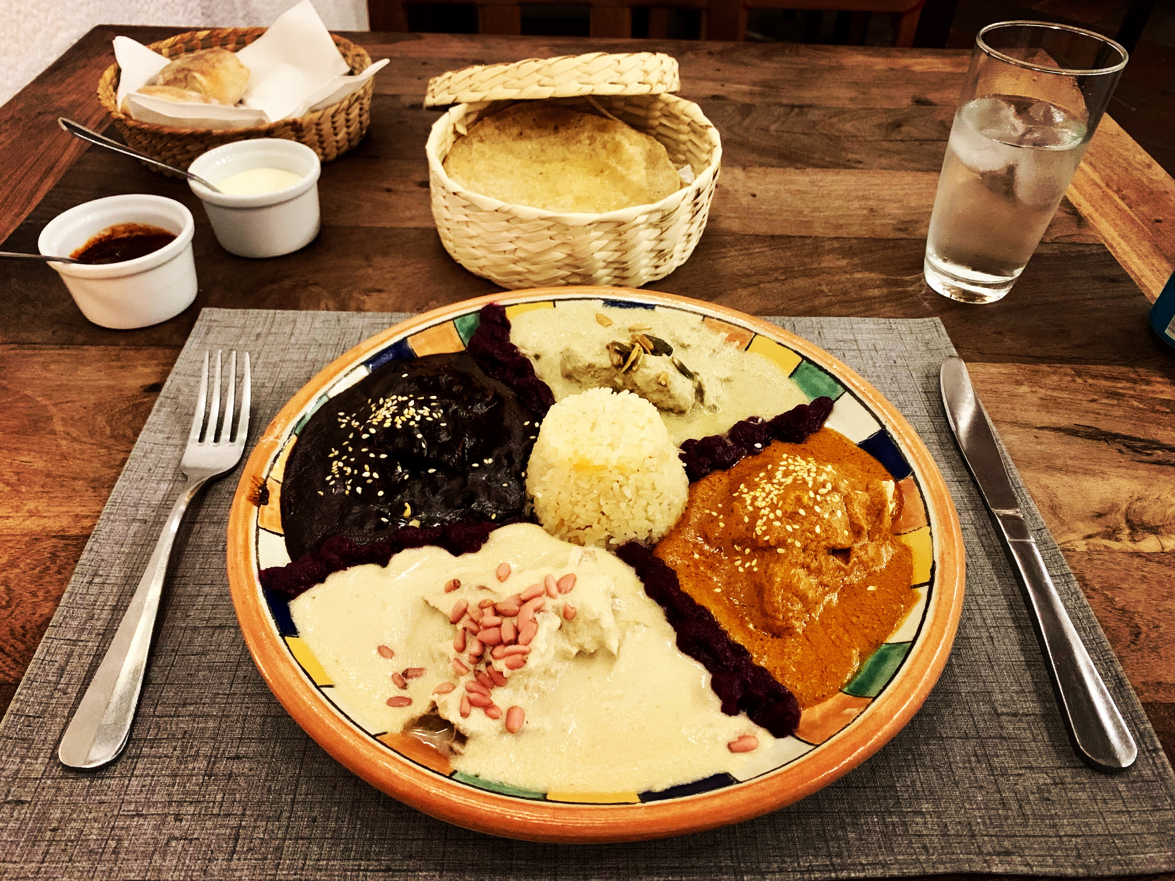 Restaurante Casareyna, Puebla, Mexico Mole sampler (classic poblano, green pipián, red pipián, white) with fresh corn tortillas Share this: Click to share on X (Opens in new window) X Click to share on Facebook (Opens in new window) Facebook Like Loading...