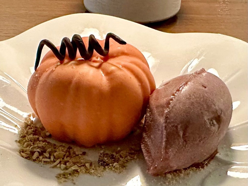 3) pumpkin entremet with rosemary cake, ginger mousse, and sugar plum sorbet