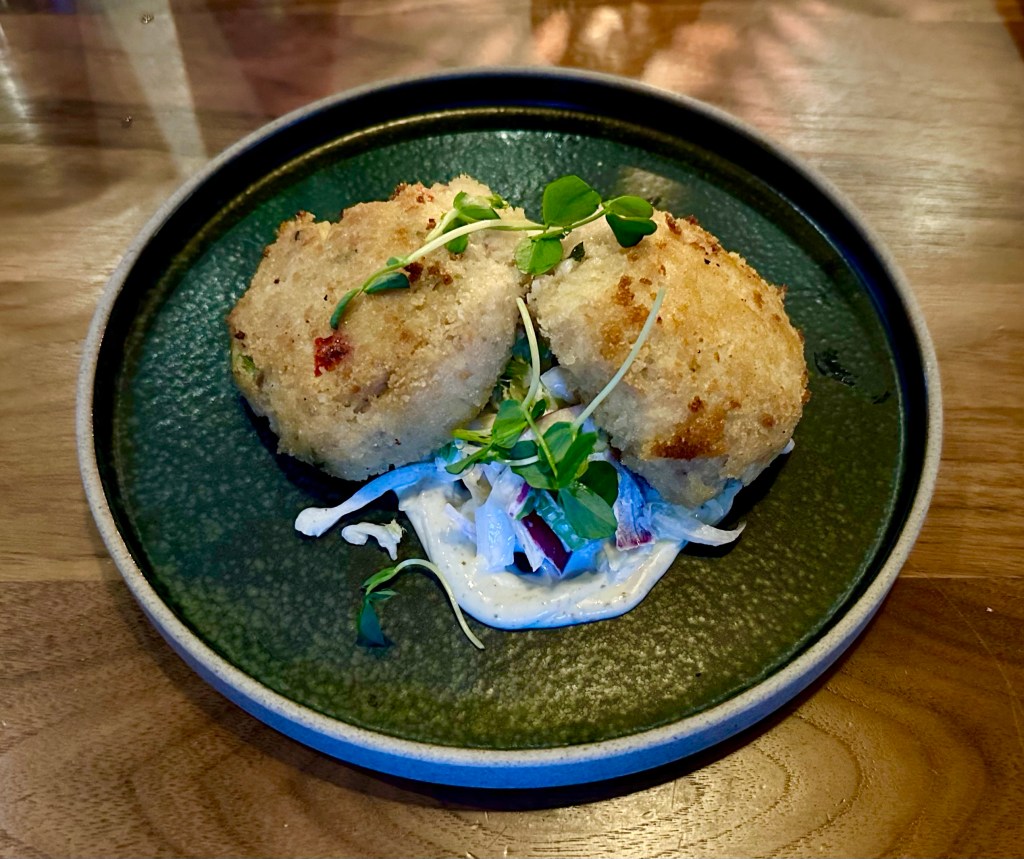 Nova Scotian crab cakes (Cape Breton snow crab and salt cod) with fennel and celery slaw and green peppercorn emulsionpan-seared Arctic char with onion soubise, squash and turmeric quinoa, charred heirloom carrots, and roasted walnuts