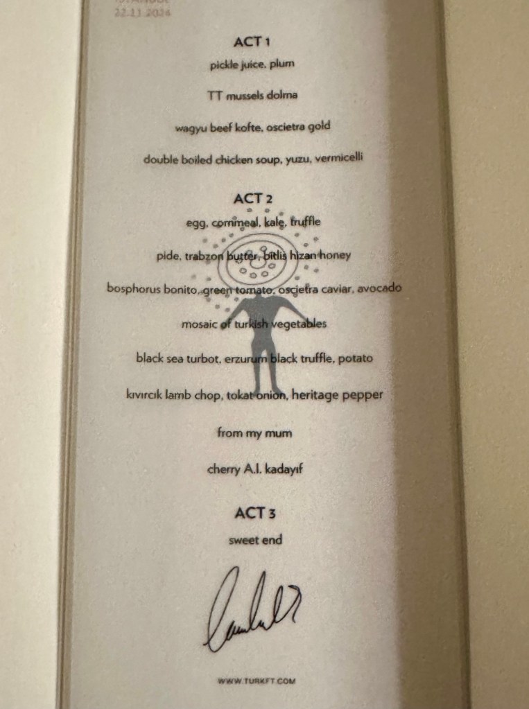 TURK Fatih Tutak, Beyoğlu, Istanbul, Türkiye A delightful 12-course (plus “surprises”) micro-seasonal tasting menu at Chef Fatih Tutak’s Two-Michelin-Starred TURK. Share this: Click to share on X (Opens in new window) X Click to share on Facebook (Opens in new window) Facebook Like Loading...